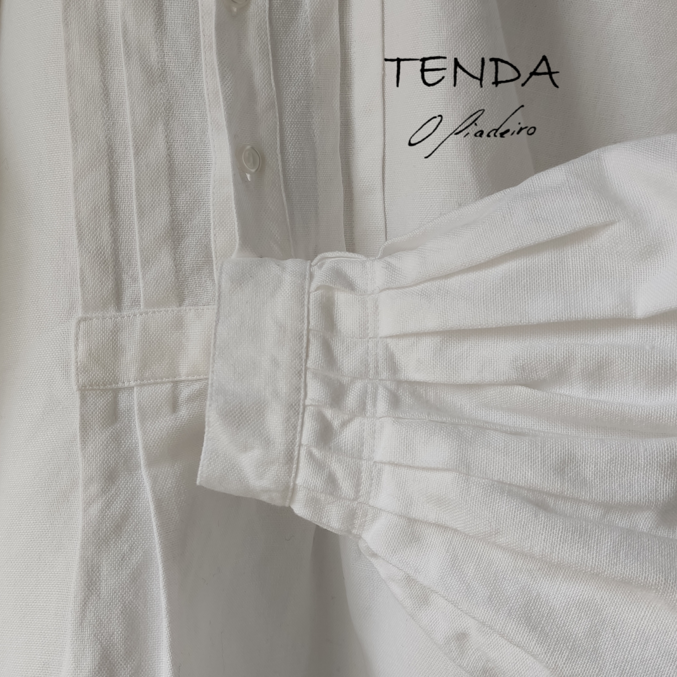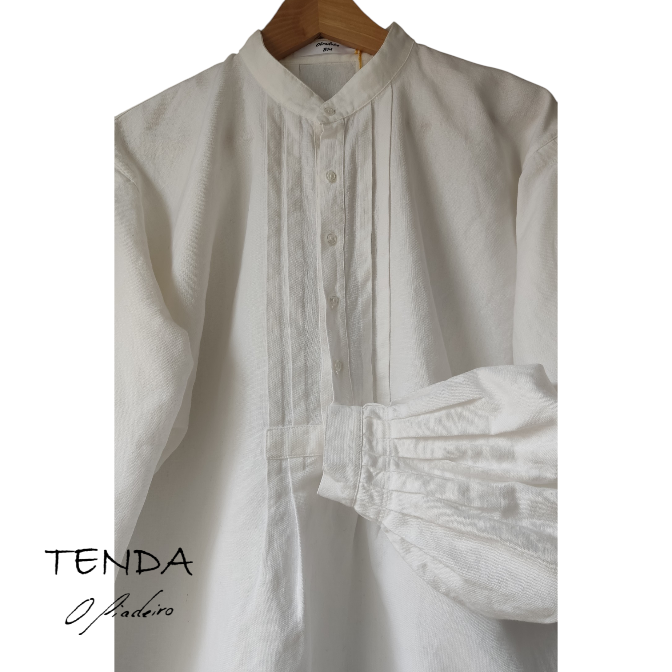 Camisa confeccionada ao xeito tradicional coas costuras dobres, pregas nas mangas e lorzas no peito e as costas.