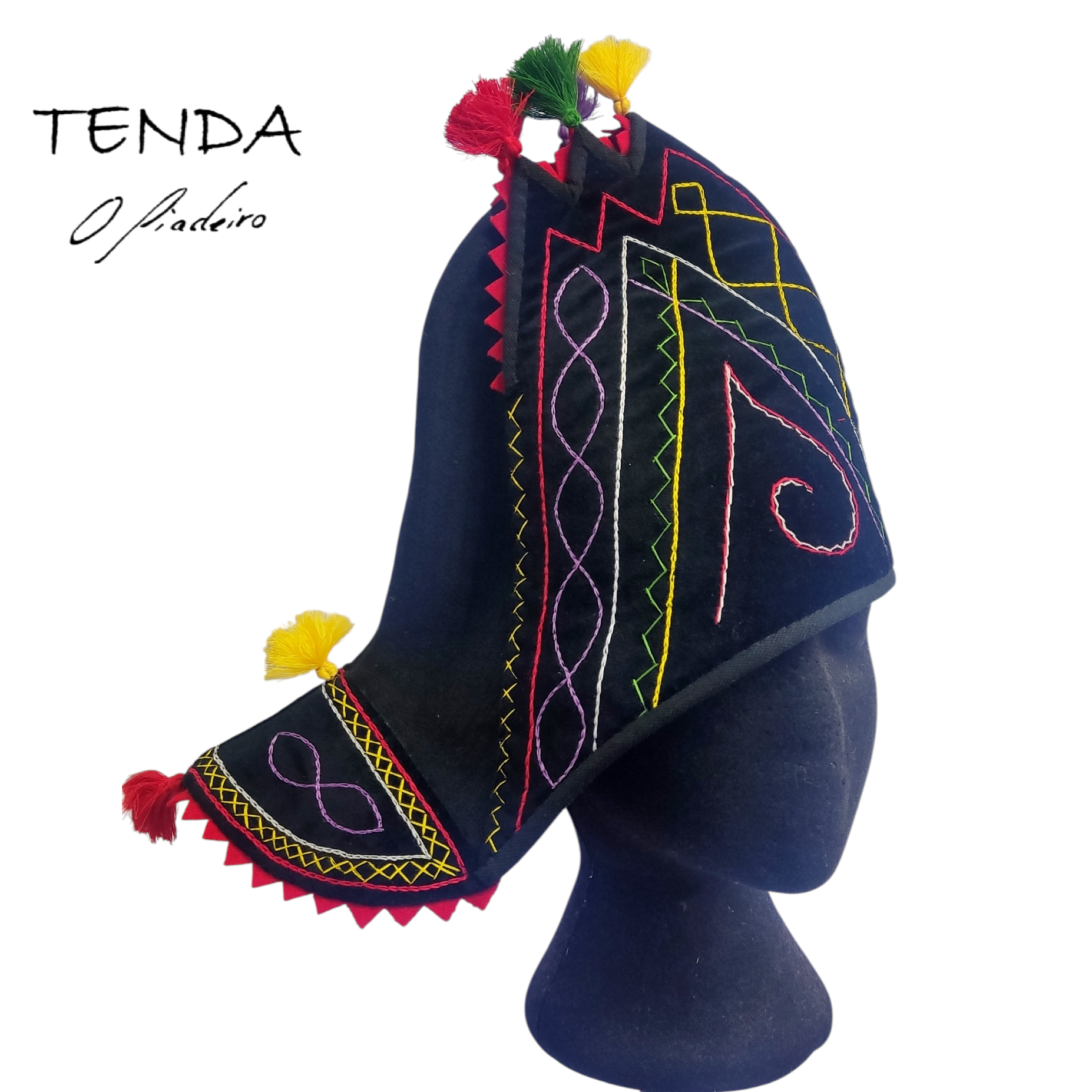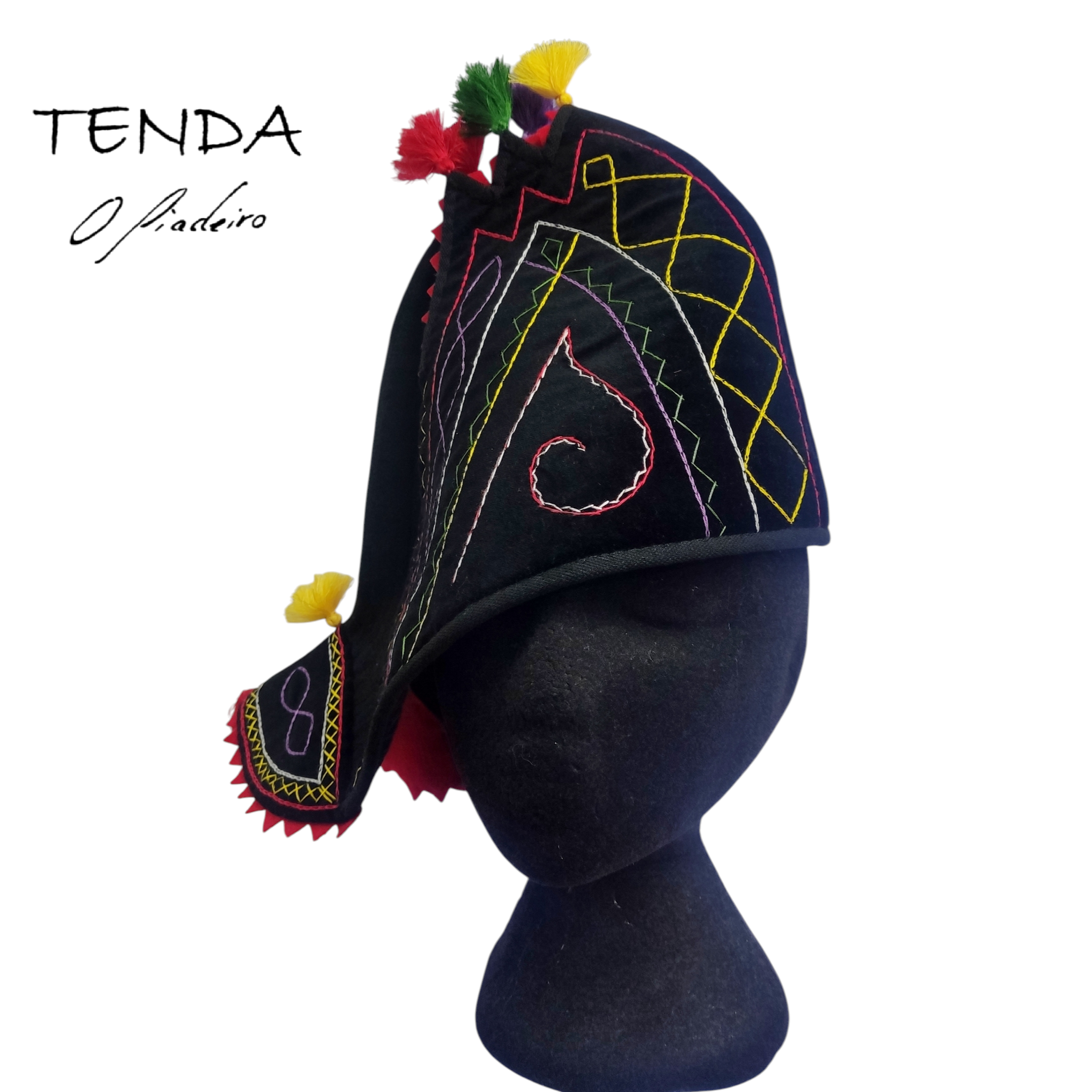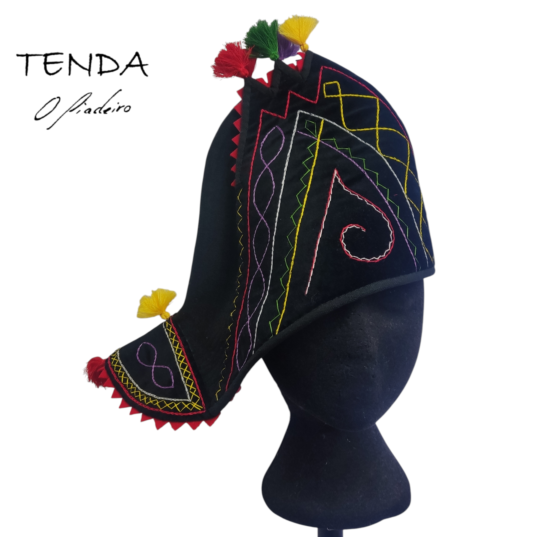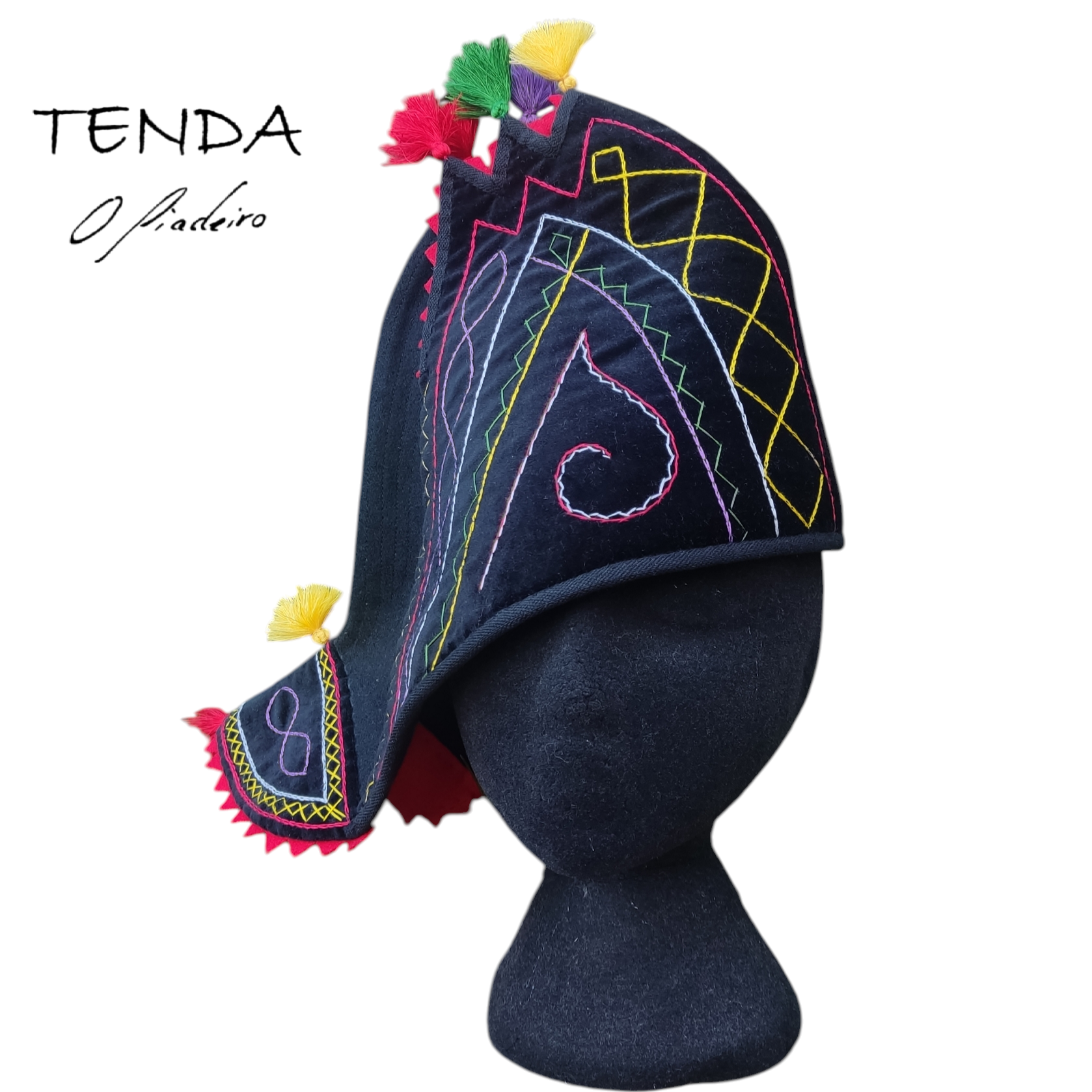 Monteira bordada a man cofeccionada en pano de la e veludo de algodón coa “cresta de picos vermella”