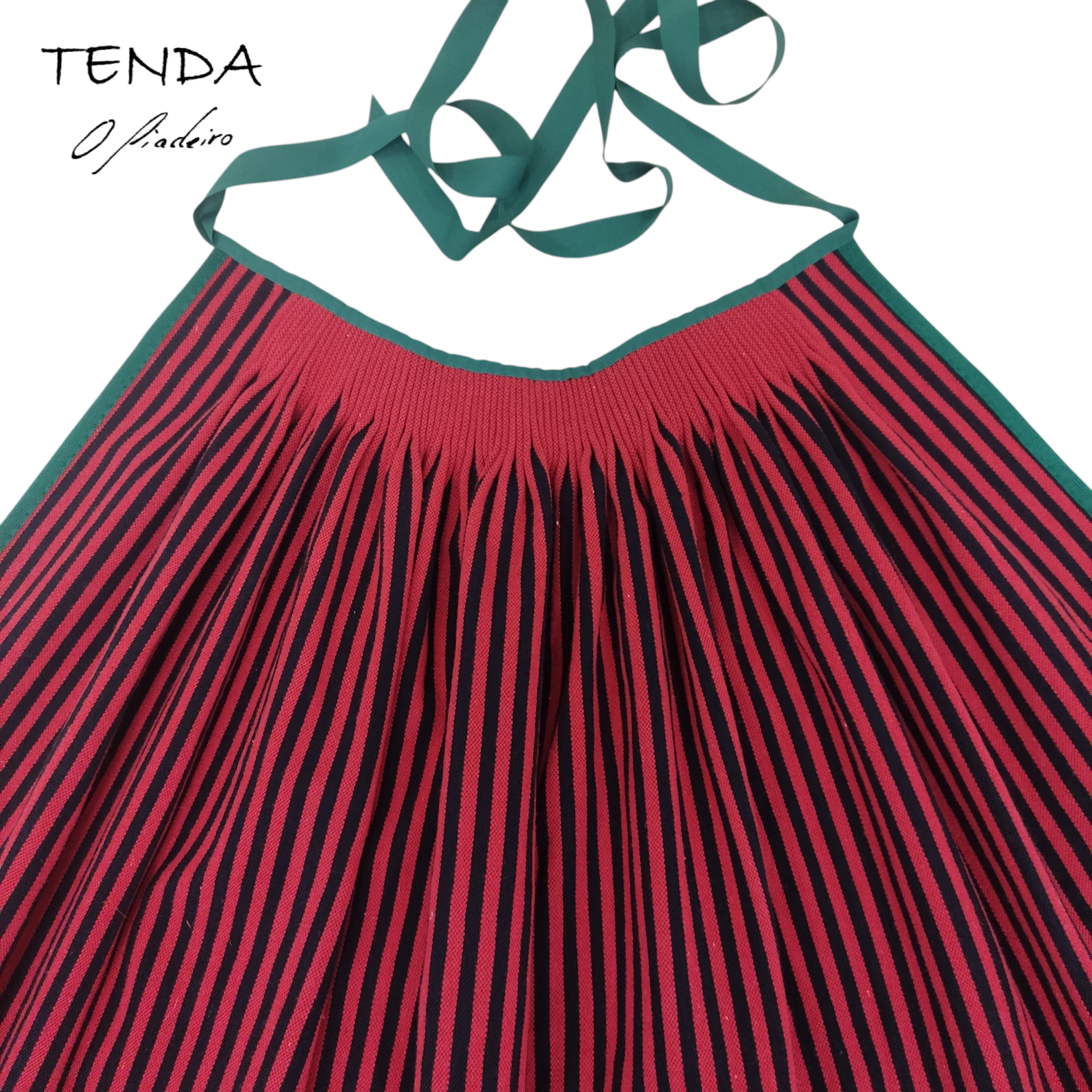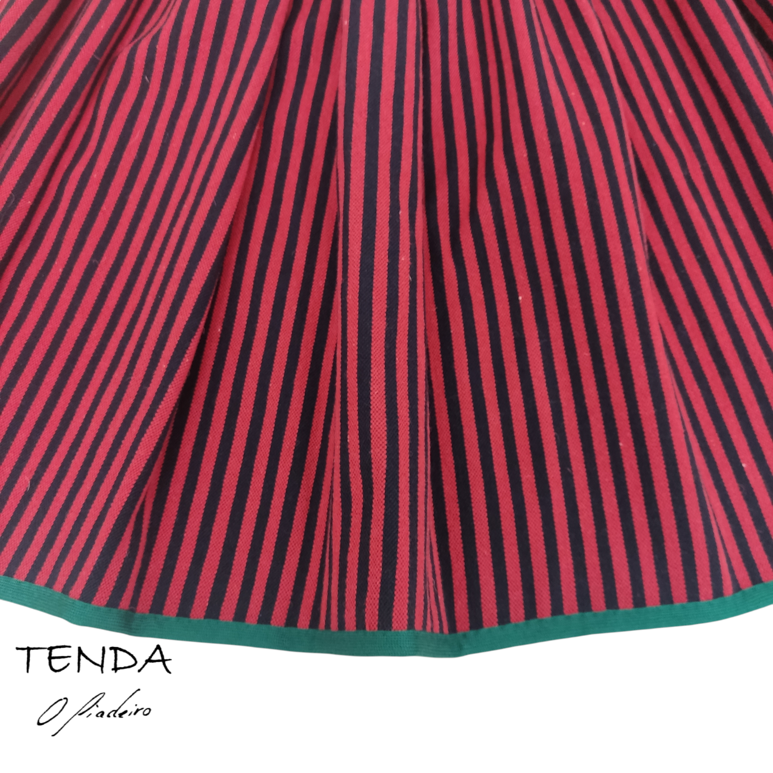 Reberetada ao redor con trencilla e cintura riscada.